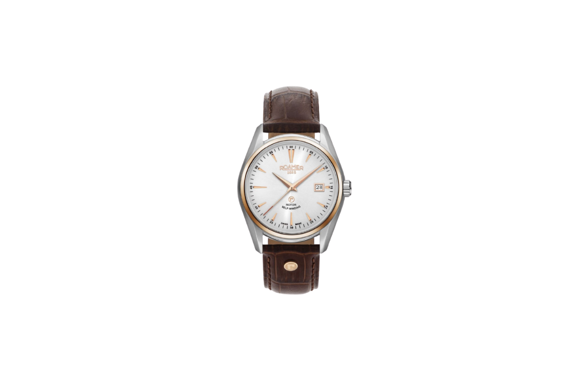 Na szarym cyferblacie, który rozjaśnia blask szlifu słonecznego, znajdują się wskazówki oraz godzinowe indeksy liniowe w kolorze różowego złota, z wyraźnie zaznaczoną godziną dwunastą, pod którą widnieje logo marki Roamer. Dokoła indeksów godzinowych poprowadzony jest okrąg drobnych, cienkich indeksów sekundowych. W miejscu godziny trzeciej producent umieścił dyskretne okienko datownika. Na dole tarczy znajduje się również sygnatura Swiss Made, która gwarantuje, że do produkcji czasomierza użyto najwyższej jakości materiałów i szwajcarskiego mechanizmu.