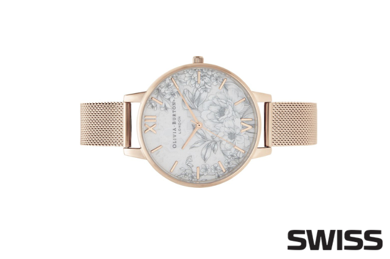 Nasz zegarek damski Olivia Burton posiada szarą, klasyczną tarczę (właśnie w tym kolorze, jak i białym oraz ecru tworzono pierwsze modele, uchodzące za najbardziej eleganckie), na której kwiaty wykonane są asymetrycznie również w kolorze szarym, ale już w mocnym odznaczającym się odcieniu: popielu. Dzięki temu wzór jest widoczny, ale na tyle subtelny, że nie zakłóca czytelności. Zegarek z kwiatami na tarczy posiada również duże indeksy zamiast cyfr – z wyjątkiem XII i VI zapisanych cyframi rzymskimi – co sprawia, że wygląda oryginalnie i nowocześnie. Zarówno wskazówki, jak i indeksy wykonane zostały w kolorze koperty, dzięki czemu są widoczne i zapewniają czasomierzowi ogromną funkcjonalność.