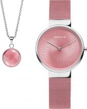 Tarcza zegarka łączy w sobie kolory różu i bieli, tworząc harmonijne połączenie, które doskonale kontrastuje z okrągłym kształtem koperty. Ten model zegarka Bering łączy w sobie przyjemność noszenia z wyrafinowanym designem, który z pewnością przyciągnie spojrzenia.