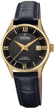 Styl tego zegarka można określić jednym słowem: klasyczny. Jego okrągła stalowa koperta w kolorze złotym emanuje subtelnym luksusem, podkreślając elegancję noszącej go kobiety. Czarny pasek ze skóry doskonale komponuje się z pozostałymi elementami, nadając całości harmonijny charakter.