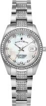 Zegarek ma kopertę w kształcie okrągłym, co sprawia, że idealnie dopasowuje się do kobiecego nadgarstka. Tarcza w delikatnym, perłowym odcieniu dodaje mu subtelności i klasy, jednocześnie uzupełniając elegancką całość.