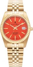 Wykonany z najwyższej jakości materiałów, zegarek posiada stalową bransoletę i kopertę w złotym kolorze. To połączenie klasycznej elegancji z nowoczesnym akcentem, które nadaje mu wyjątkowy charakter. Kształt okrągłej koperty doskonale komponuje się z delikatnością linii i precyzją wykonania.