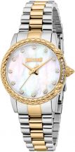 Na tle turkusowej tarczy pięknie prezentują się złote wskazówki, logo marki Just Cavalli oraz indeksy w formie kryształków, które delikatnie odbijają światło. Okrągła koperta idealnie dopasowuje się do kobiecego nadgarstka, a zintegrowana bransoleta tworzy spójną, elegancką linię.