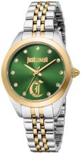Na tle jasnej tarczy wyróżniają się punktowe indeksy oraz złote logo marki Just Cavalli, a u dołu subtelnie wkomponowano dekoracyjny monogram "JC" – charakterystyczny motyw dla kolekcji. Całość emanuje czystością formy i modową subtelnością.