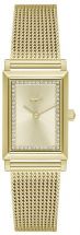Złota tarcza zegarka stanowi interesujący kontrast, który przyciąga wzrok i nadaje zegarkowi niepowtarzalny charm. Kształt koperty w formie prostokąta nadaje mu nowoczesności, jednocześnie wpisując się w klasykę, która nigdy się nie nudzi.
