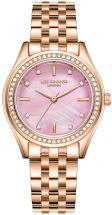 Jednak to nie wszystko, co wyróżnia ten model. Zegarek posiada przepiękną zieloną tarczę, która nadaje mu świeżości i oryginalności, stanowiąc interesujący kontrast do złotej kolorystyki. Kształt okrągłej koperty doskonale komponuje się z delikatnie wygiętym designem bransolety, tworząc harmonijną całość.