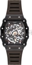 Jego pasek został wykonany z wysokiej jakości silikonu, co gwarantuje wygodę noszenia oraz trwałość. Kombinacja materiałów koperty - stali i mosiądzu - sprawia, że zegarek jest solidny, a jednocześnie lekki. Kolorystyka zegarka utrzymana jest w eleganckim, stonowanym stylu - czarny pasek, czarna koperta oraz czarna tarcza tworzą spójną kompozycję, która nadaje zegarkowi charakteru i klasy.