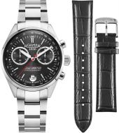 Koperta z charakterystycznym, okrągłym kształtem, idealnie komponuje się z tarczą w kolorze stalowo-czarnym, nadając całości nowoczesnego, dynamicznego wyglądu. Dodatkowy pasek z eleganckiej skóry w kolorze czarnym dodaje elegancji i klasy, idealnie kompletując całość.